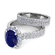 Two Row Diamond and Sapphire Engagement Ring Bridal Set in 14k Gold, 9x7mm
