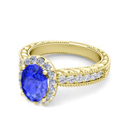 Vintage Inspired Diamond and Ceylon Sapphire Engagement Ring in 18k Gold, 7x5mm
