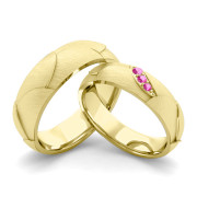 Brushed Finish Matching Wedding Band in 18k Gold 3 Stone Pink Sapphire Wedding Rings