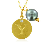 Initial Necklace, Letter Y Diamond Pendant with a Pearl Charm in 18k Yellow Gold