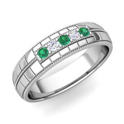 Emerald and Diamond Mens Wedding Band in Platinum 5 Stone Ring, 5mm