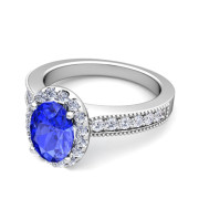 Milgrain Diamond and Ceylon Sapphire Halo Engagement Ring in Platinum, 7x5mm