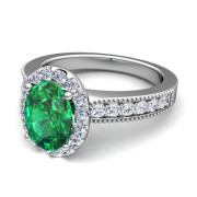 Milgrain Diamond and Emerald Halo Engagement Ring in Platinum, 7x5mm