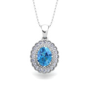 Lace Diamond and Blue Topaz Necklace in 14k Gold Halo Pendant 8x6mm