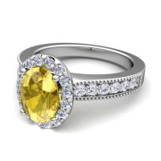 Milgrain Diamond and Yellow Sapphire Halo Engagement Ring in 14k Gold, 9x7mm