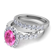 Halo Bridal Set: Pave Diamond and Pink Sapphire Wedding Ring Set in 14k Gold, 9x7mm