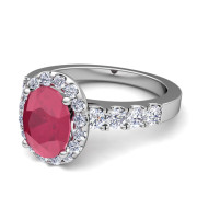 Brilliant Pave Set Diamond and Ruby Halo Engagement Ring in Platinum, 7x5mm