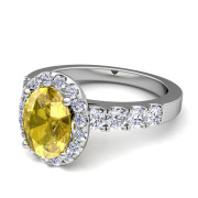 Brilliant Pave Set Diamond and Yellow Sapphire Halo Engagement Ring in Platinum, 7x5mm
