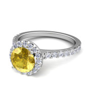 Petite Pave Set Diamond and Yellow Sapphire Halo Engagement Ring in Platinum, 6mm