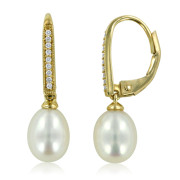 White Sapphire and Pearl Drop Earrings in 10k Yellow Gold