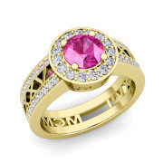 Roman Numeral Engagement Ring in 14k Gold Halo Pink Sapphire Ring, 7mm