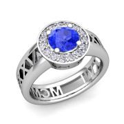 Roman Numeral Ceylon sapphire Engagement Ring in Platinum Halo Setting, 5mm