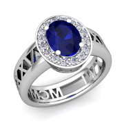 Halo Sapphire Engagement Ring in Platinum Roman Numeral Band, 7x5mm