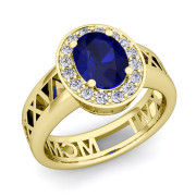 Halo Sapphire Engagement Ring in 18k Gold Roman Numeral Band, 9x7mm