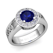 Roman Numeral Engagement Ring in Platinum Halo Sapphire Ring, 5mm