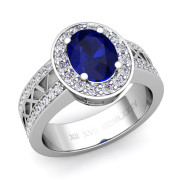 Halo Sapphire Engagement Ring in Platinum Roman Numeral Band, 7x5mm