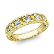 Vintage Inspired Diamond and Yellow Sapphire Wedding Ring Band in 18k Gold
