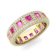 Pave Diamond and Princess Cut Pink Sapphire Eternity Band in 18k Gold, 6mm